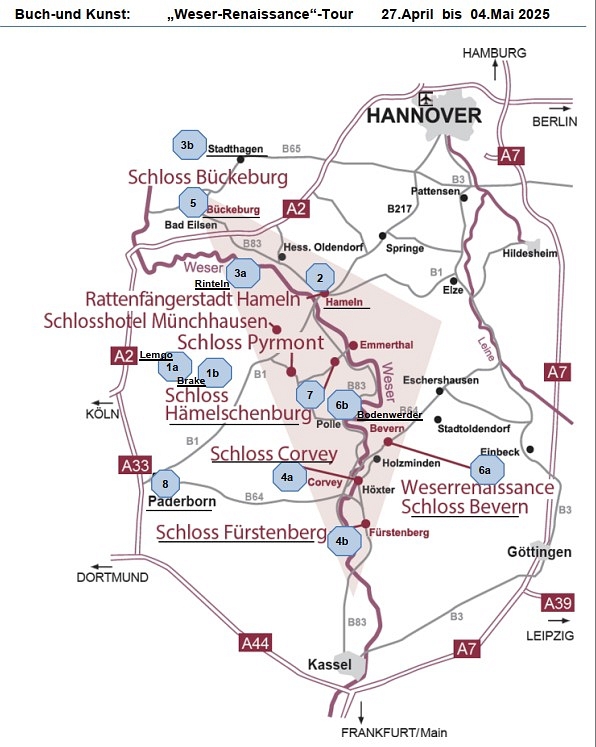 Schloss Fürstenberg mit Besuch und Diskussion in der Werkstatt, die Eindrücke in der ehemaligen Benediktiner Abtei „Schloss Corvey“, die Führung im Schloss Bevern, dem ehemaligen Sitz derer v.